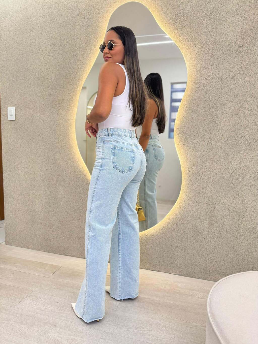 Descrição: Calça Wide Leg Jeans Claro — a peça perfeita para um look moderno e estiloso! Com modelagem ampla e caimento impecável, esse calçado valoriza a silhueta, conforto e moda. Feita em jeans de alta qualidade, possui cintura alta, fechamento por zíper e botão, além de bolsos funcionais. Ideal para compor looks versáteis, do casual ao sofisticado. Combine com croppeds, camisas ou blusas ajustadas para um visual incrível!