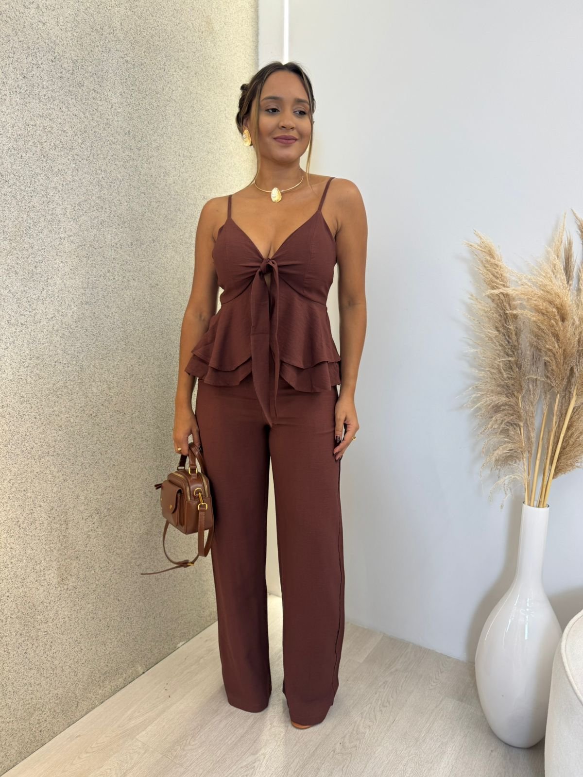 CONJUNTO CALÇA PANTALONA E BLUSA PEPLUM EM ALFAIATARIA MARANT ANA CECILIA MARROM