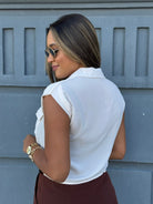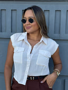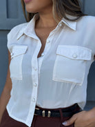 Descrição: Camisa sem mangas em tecido leve, com gola clássica e fechamento frontal por botões encapados. Possui dois bolsos frontais com lapela e botão, trazendo um toque utilitário e moderno ao visual. Versátil e elegante, é perfeita para compor looks frescos e sofisticados em dias mais quentes.