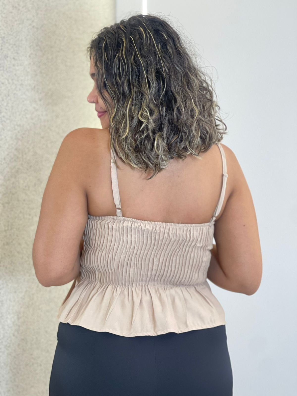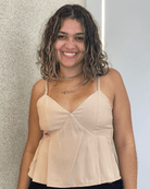 Possui decote em V suave, com recortes estruturados no busto que proporcionam melhor caimento e sustentação. As alças finas delicadas garantem leveza e feminilidade, enquanto a modelagem peplum cria um efeito elegante e acinturado, valorizando a silhueta. O acabamento em costura pespontada traz sofisticação extra e reforça o estilo de alfaiataria, perfeito para composições modernas e elegantes.