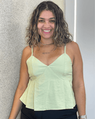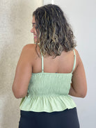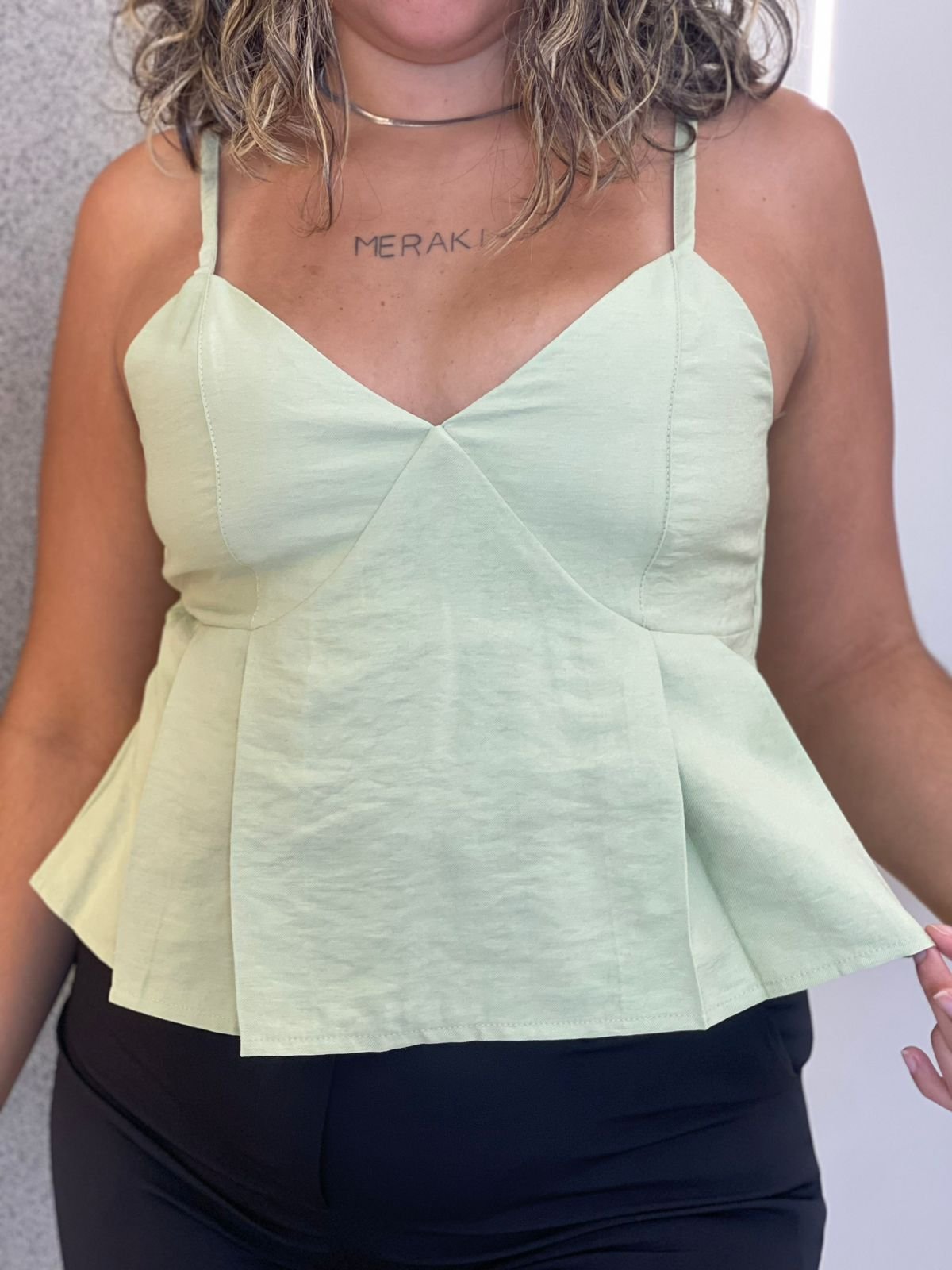 Possui decote em V suave, com recortes estruturados no busto que proporcionam melhor caimento e sustentação. As alças finas delicadas garantem leveza e feminilidade, enquanto a modelagem peplum cria um efeito elegante e acinturado, valorizando a silhueta. O acabamento em costura pespontada traz sofisticação extra e reforça o estilo de alfaiataria, perfeito para composições modernas e elegantes.