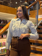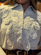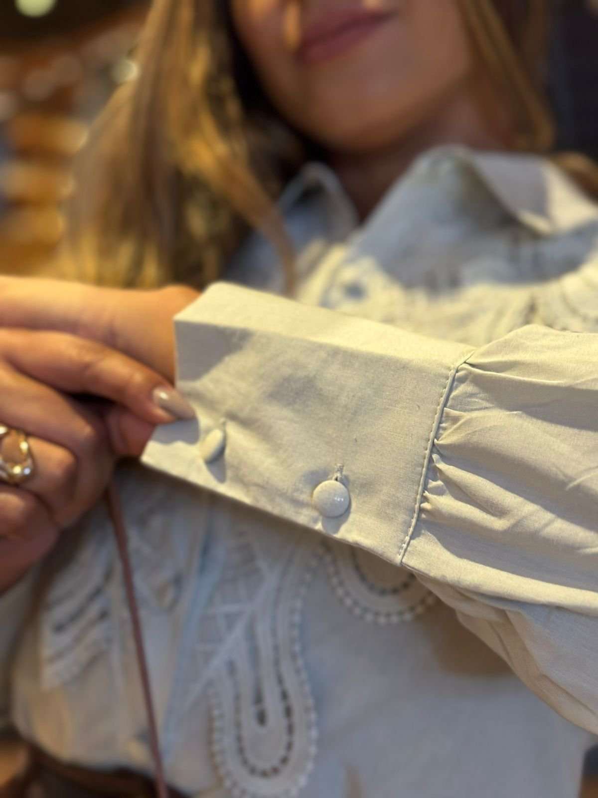 BLUSA SOCIAL BORDADA EM CREPE JASMIM CINZA