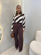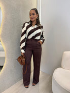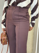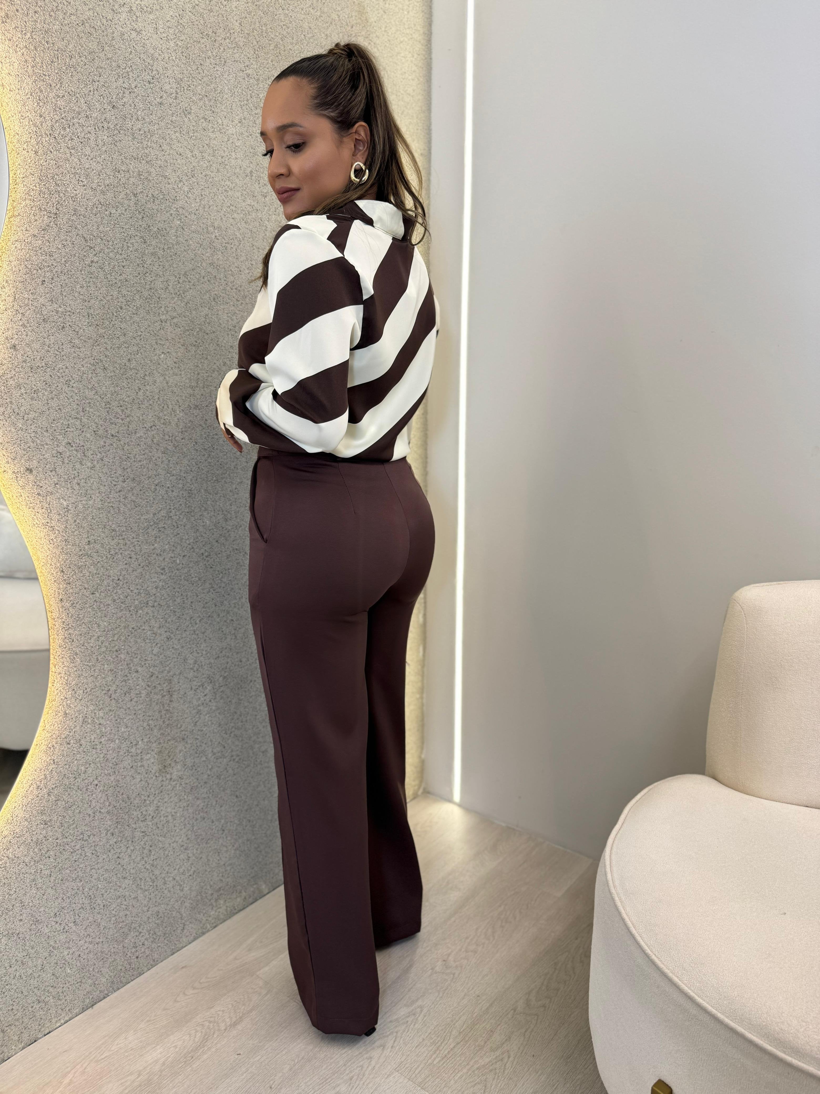 A cor marrom é uma tendência que veio para ficar e combina perfeitamente com diversas tonalidades, permitindo a criação de looks versáteis e elegantes. A calça pantalona, com sua modelagem ampla e fluida, é ideal para valorizar todos os tipos de corpo, trazendo um ar de sofisticação e leveza ao visual.