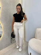 Além disso, a calça possui detalhes em alfaiataria, como bolsos frontais e traseiros, e fechamento por zíper e botão, que agregam ainda mais charme e estilo à peça. Seu corte reto e comprimento longo proporcionam um visual alongado e elegante, perfeito para qualquer ocasião.