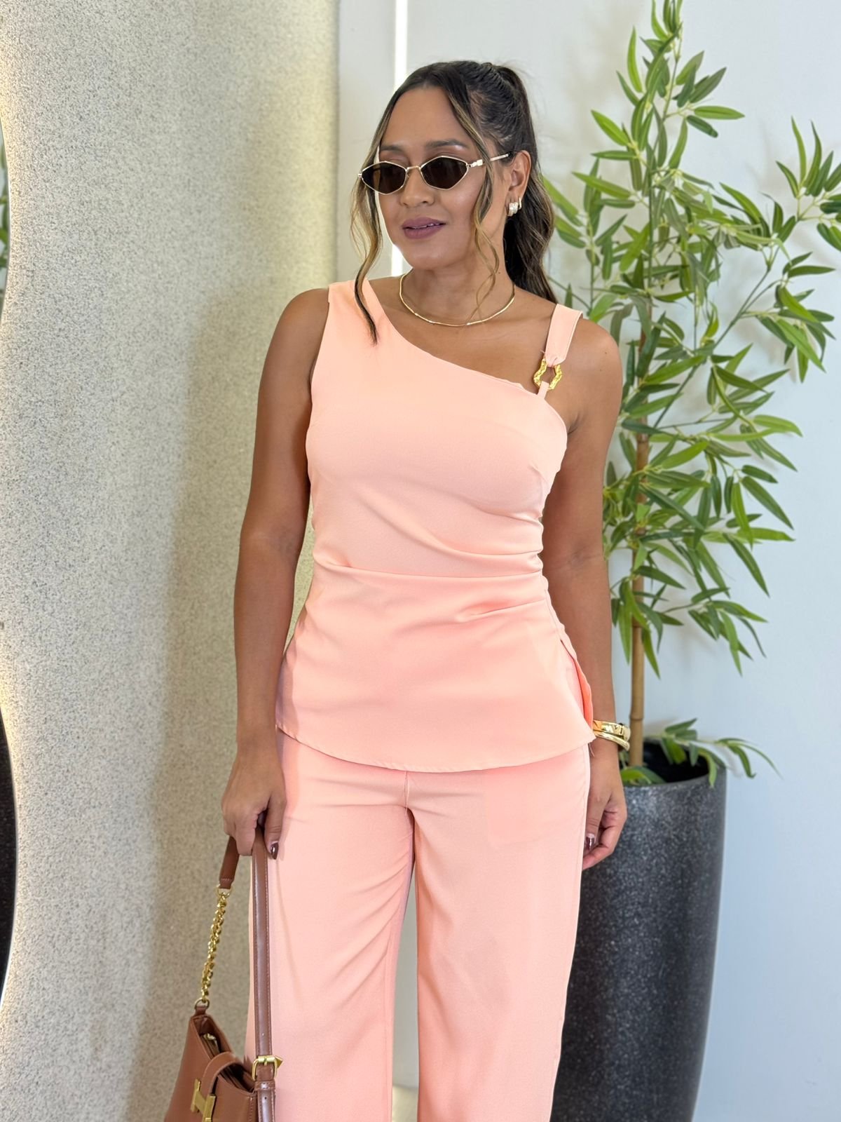 - Blusa: modelagem levemente estruturada, com alças ajustáveis e recortes estratégicos que valorizam a silhueta. O tecido encorpado proporciona um acabamento elegante e atual.