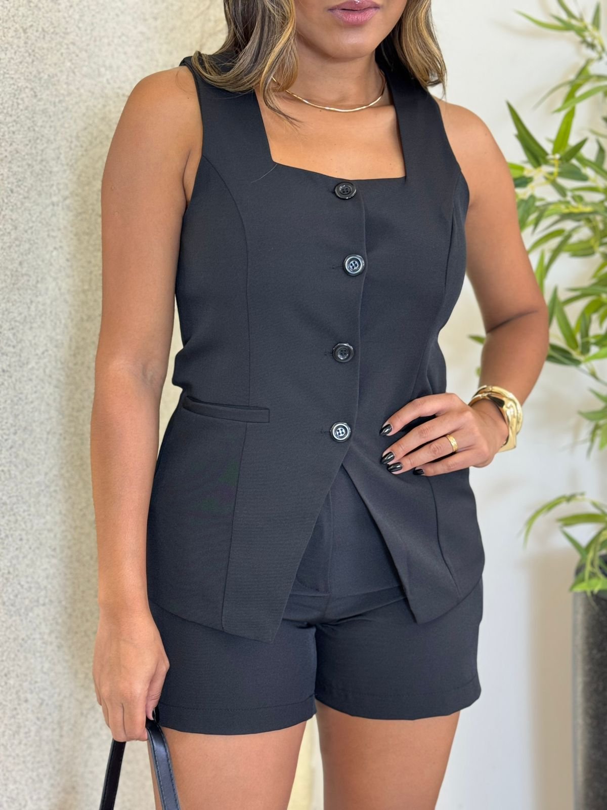 Elegância e modernidade em um só look! O conjunto é confeccionado em tecido de alfaiataria, garantindo caimento impecável e toque sofisticado. O blazer sem mangas possui decote quadrado, fechamento frontal com botões e recortes que valorizam a silhueta. Os bolsos embutidos trazem um charme extra e funcionalidade. O short de cintura média tem modelagem soltinha, com barra levemente dobrada para um acabamento delicado.