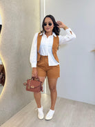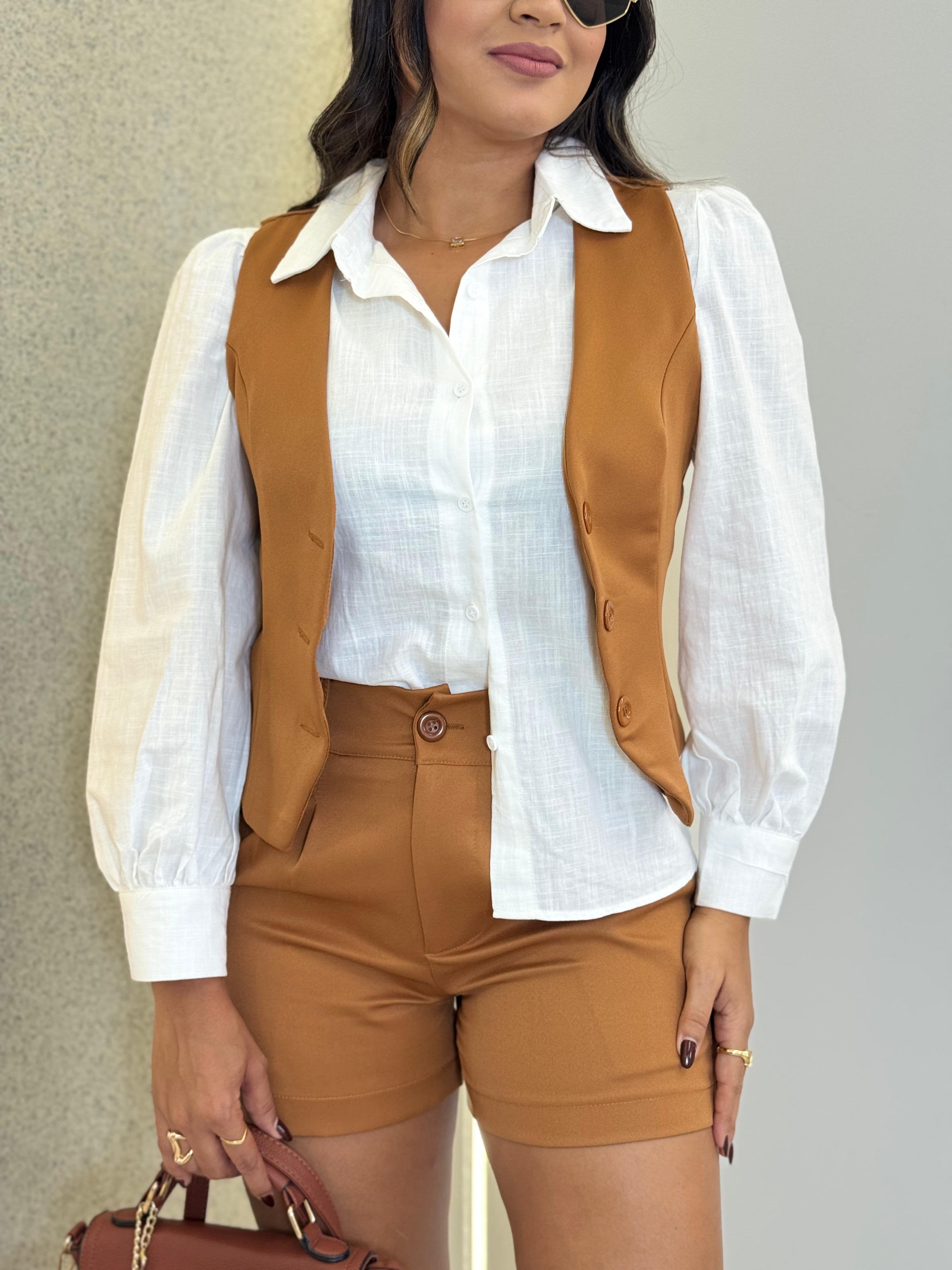 Descrição: Conjunto estiloso composto por colete e short, ideal para composições modernas e cheias de personalidade. O colete traz um corte reto e estruturado, perfeito para usar fechado ou sobreposto a outras peças, enquanto o short oferece conforto e liberdade de movimento, com modelagem que valoriza a silhueta. Feito em tecido leve e respirável, é a escolha ideal para os dias mais quentes sem abrir mão do estilo.