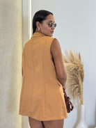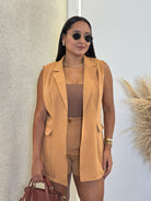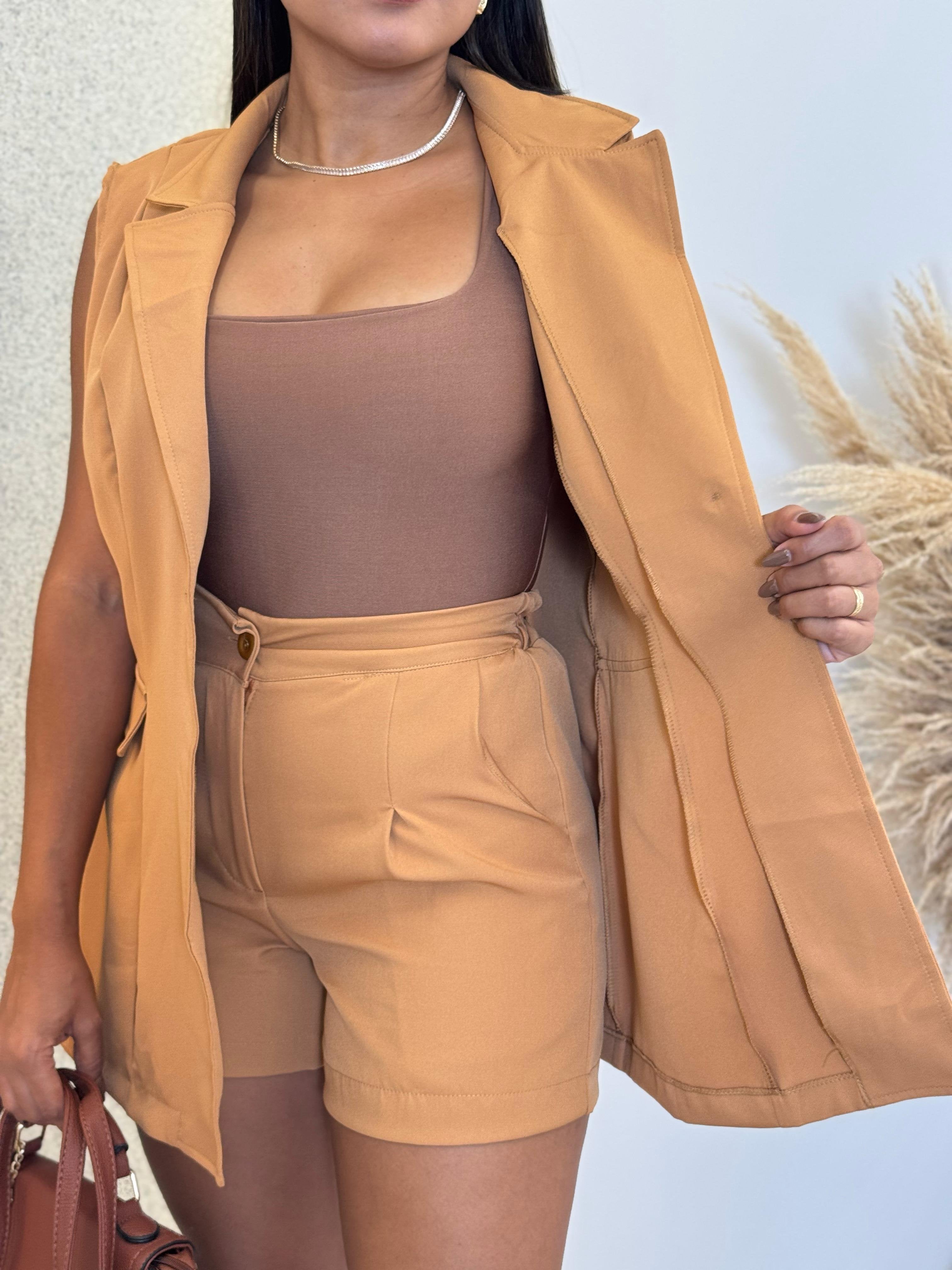 Descrição: Este conjunto de alfaiataria, composto por short e colete, é a perfeita fusão entre o clássico e o contemporâneo. Confeccionado com tecidos nobres e cortes precisos, o modelo destaca-se pelo caimento impecável e pelo design sofisticado, ideal para ocasiões que exigem elegância sem abrir mão do conforto. O colete, com sua modelagem estruturada e detalhes sutis, harmoniza-se com o short, que traz um toque moderno e descontraído, criando um visual versátil e refinado. Seja para um evento social ou para um dia de trabalho, esse conjunto traduz confiança, estilo e um acabamento artesanal de alta qualidade.