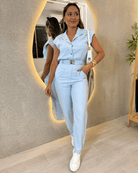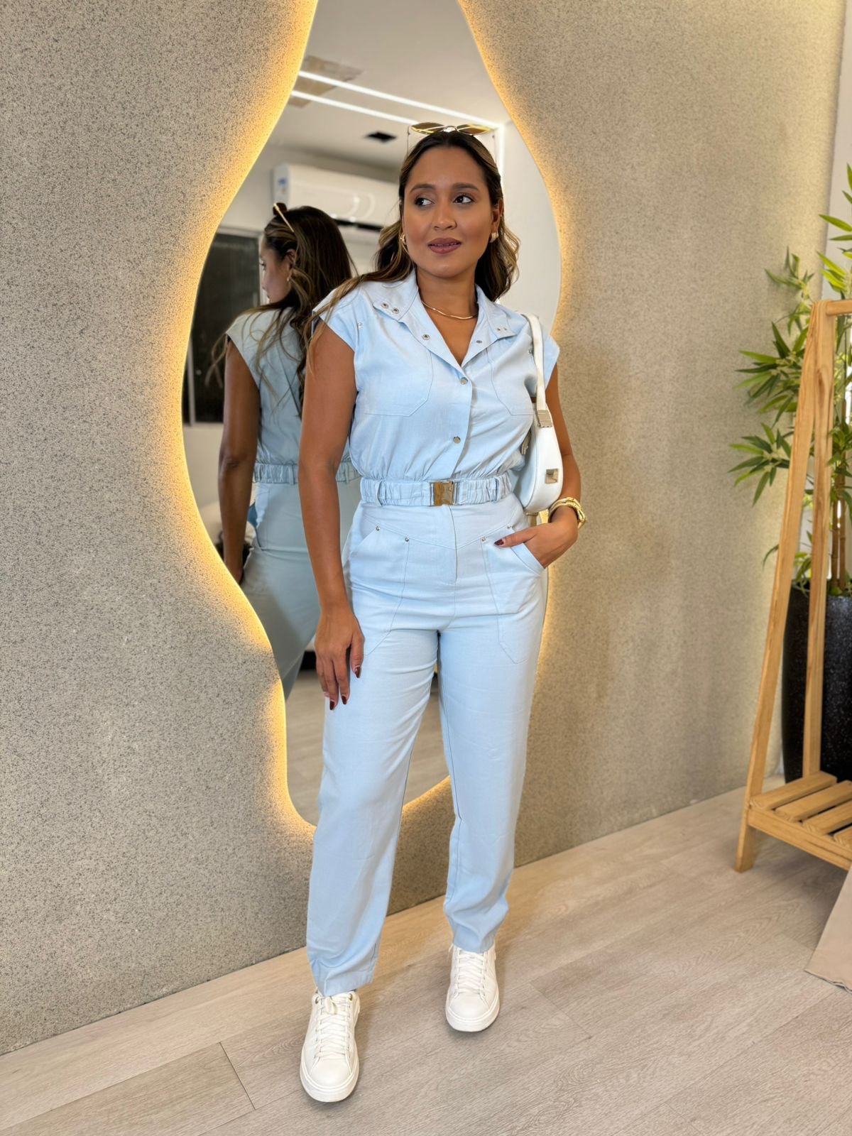 MACACÃO EM ALFAIATARIA MANGA CURTA + CINTO OLIVIA AZUL