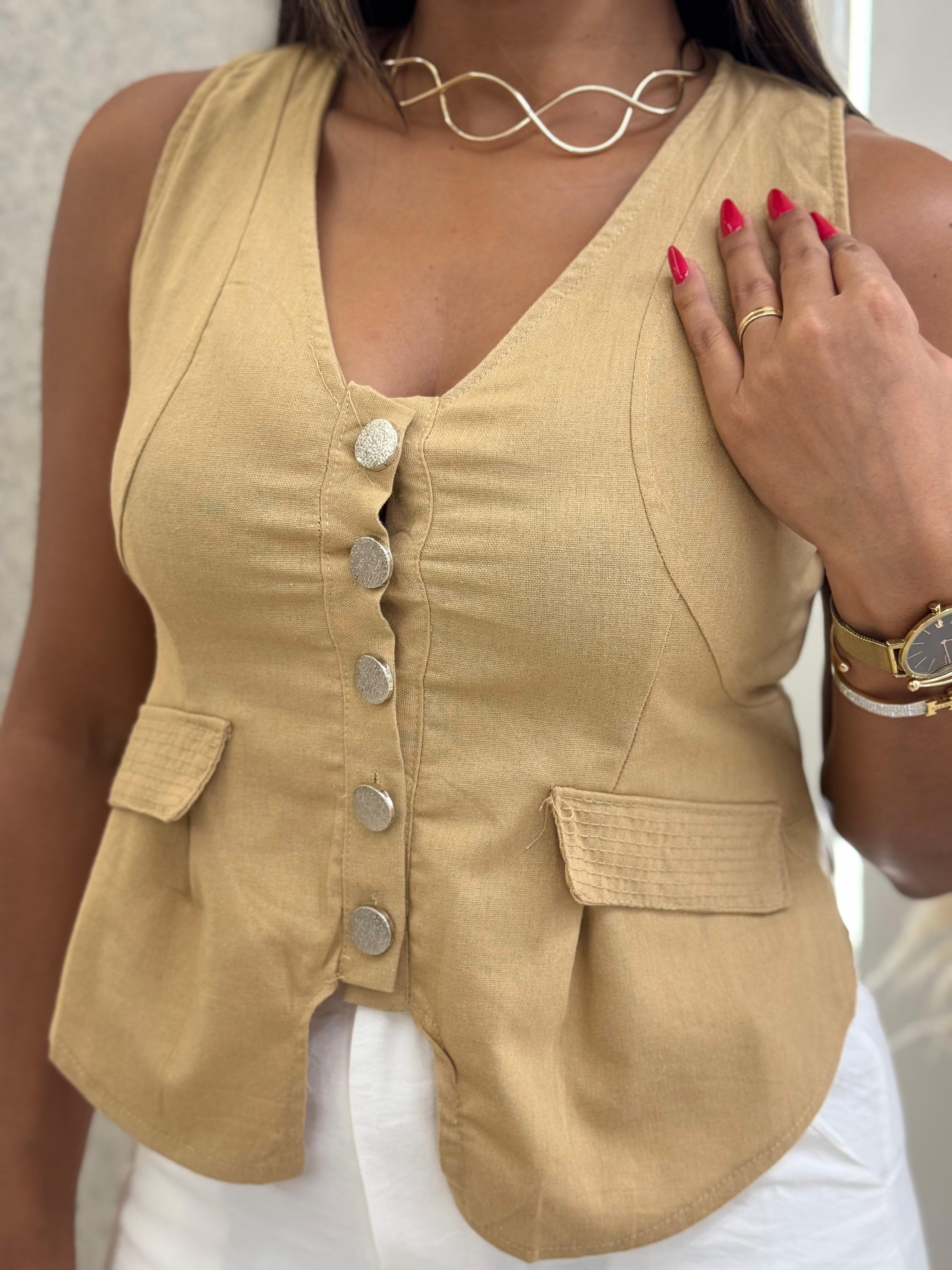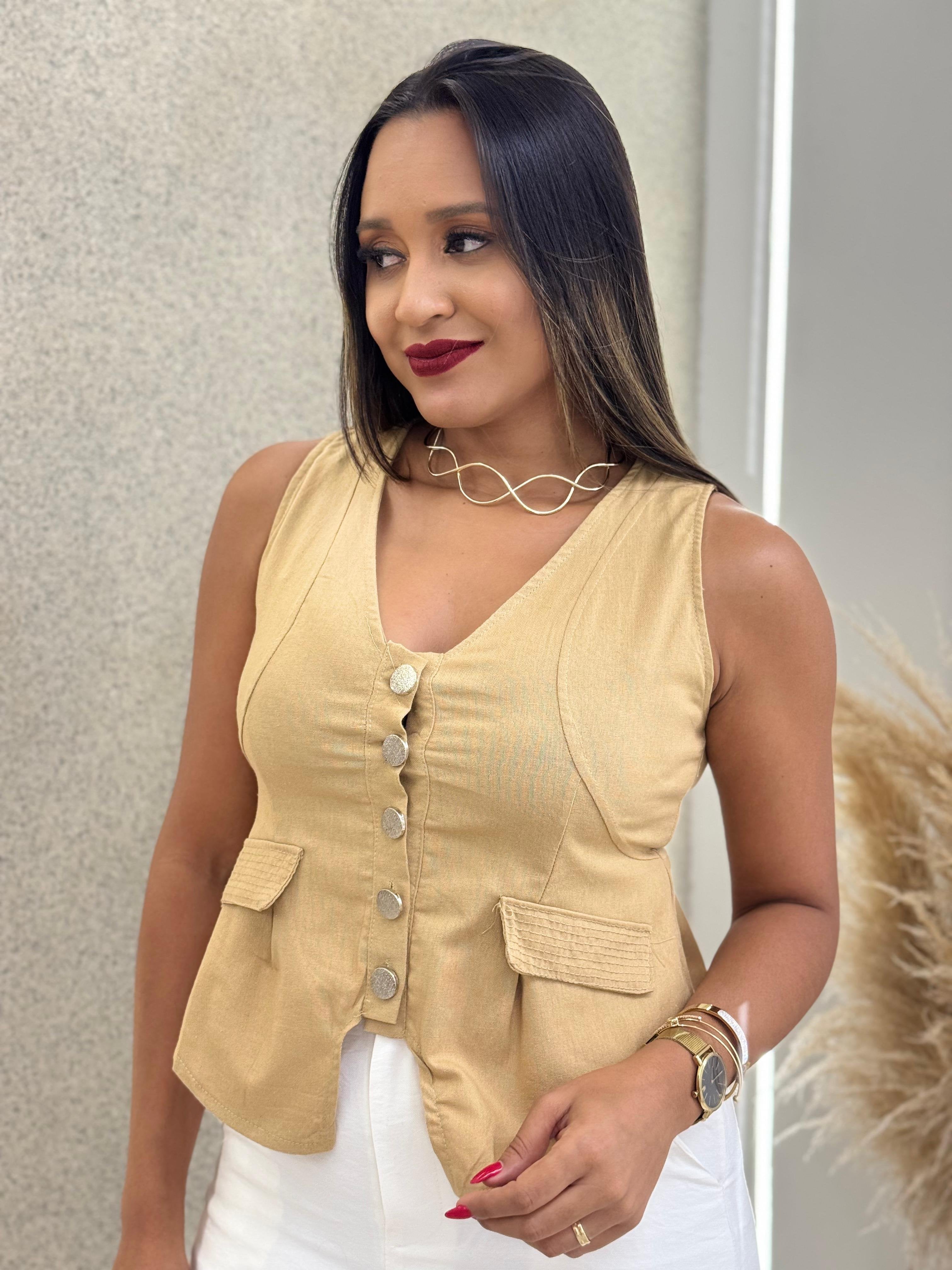 Além disso, o colete possui detalhes únicos que o tornam ainda mais especial. Seu fechamento em botões dourados adiciona um toque de sofisticação, enquanto os bolsos frontais são práticos e funcionais.