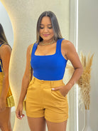 SHORT SOCIAL FEMININO EM ALFAIATARIA LINDA MOÇA EXCLUSIVE ZOE MOSTARDA