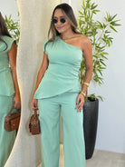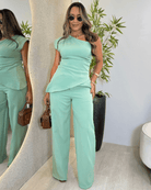 - Modelagem: Calça pantalona + blusa assimétrica de um ombro só