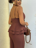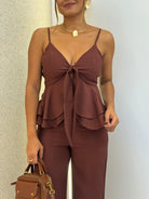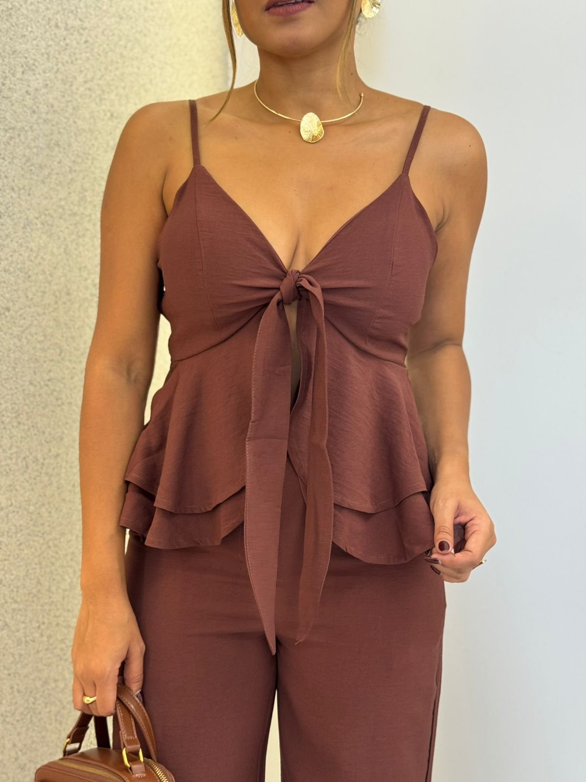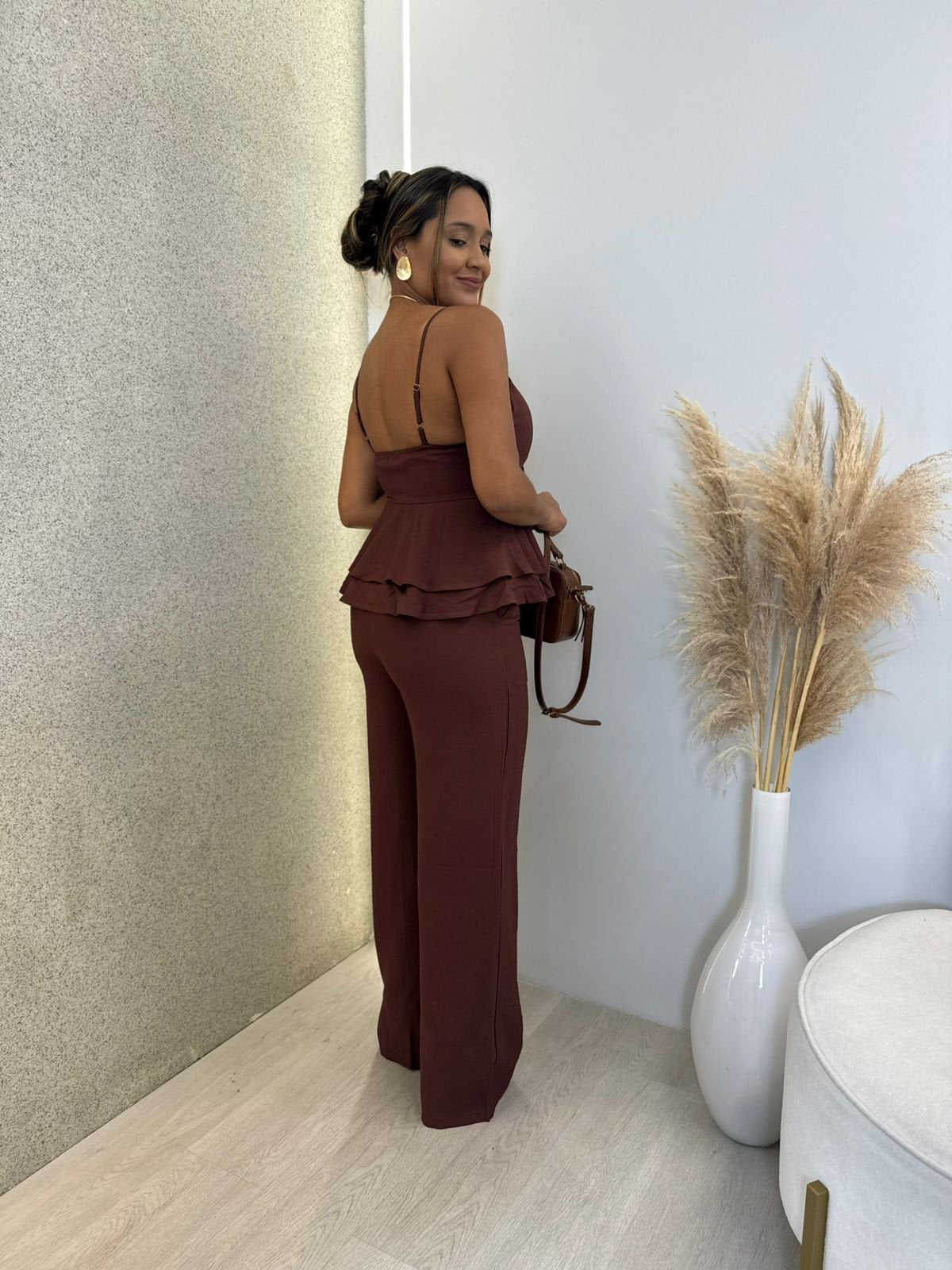 CONJUNTO CALÇA PANTALONA E BLUSA PEPLUM EM ALFAIATARIA MARANT ANA CECILIA MARROM
