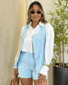 CONJUNTO COLETE ALONGADO + SHORT EM ALFAIATARIA SARA AZUL