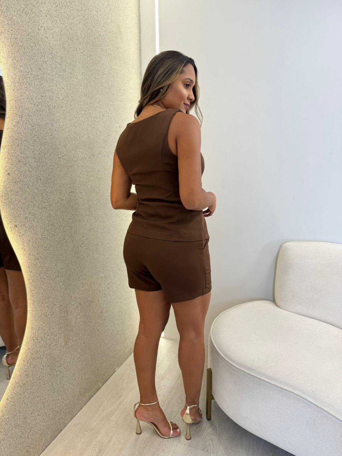 CONJUNTO COLETE COM SHORT EM ALFAIATARIA POLLY MARROM