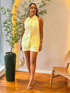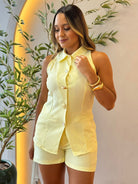 CONJUNTO COLETE+SHORT EM ALFAIATARIA BRUNA AMARELO